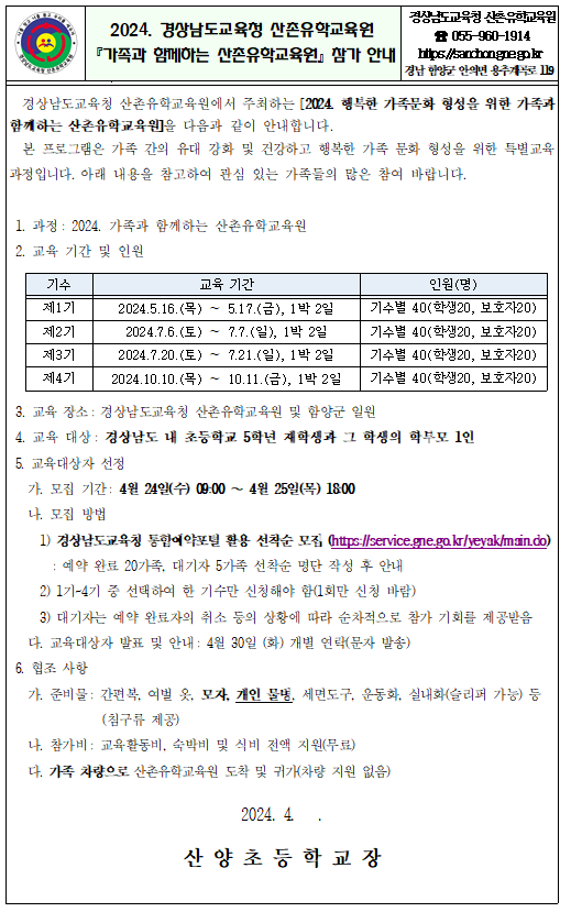 [산양초등학교-3987 (첨부) 경상남도교육청 산촌유학교육원 인재양성과] 2024. 가족과 함께하는 산촌유학교육원 안내장(배포용).hwp